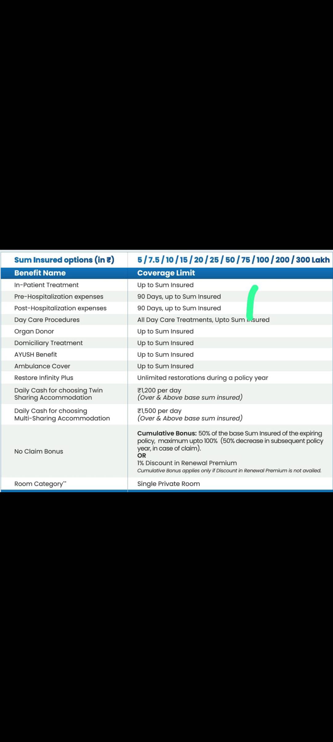 1)Hospitalizaion : Multiple Time , : Allowed, First Year : Each Time : upto Sum Insured Value 15 Lakh तक ले पाएंगे। 2)Claim लेने पर भी 5 years बाद, 6 Times , Increase होकर 6 x 15 : 90 Lakh की होगी तब आप Each Time 90 Lalh तक का Benefits ले सकेंगे । 3)Hospitalization से पहले के 90 Days + After Hospitalization 90 Days तक Medical Benifeets ले सकेंगे । 4)Daily CashBack Rsc 1200 भी मिलेगा । 5)Unlimited Claim or More than Your Insured Limit : Example Rs 22000 or 5 Corore का लाभ Only One Time, Full Life ले सकते है । 6)Any Poor Condition of Patient or Absence of Space in Hospitalizations :: Home Treatment का भी लाभ ले सकते । 7)Room Category : Only Sungle A C Room 8)Requirment होने पर Domestic : Airambulance /Aeroplane भी Free ले सकेंगे 9) Rs 10950 , Rs /Yr,, for Age Group :: 26 + 27 Year , *Payment से ये Plan ले सकेंगे ।*